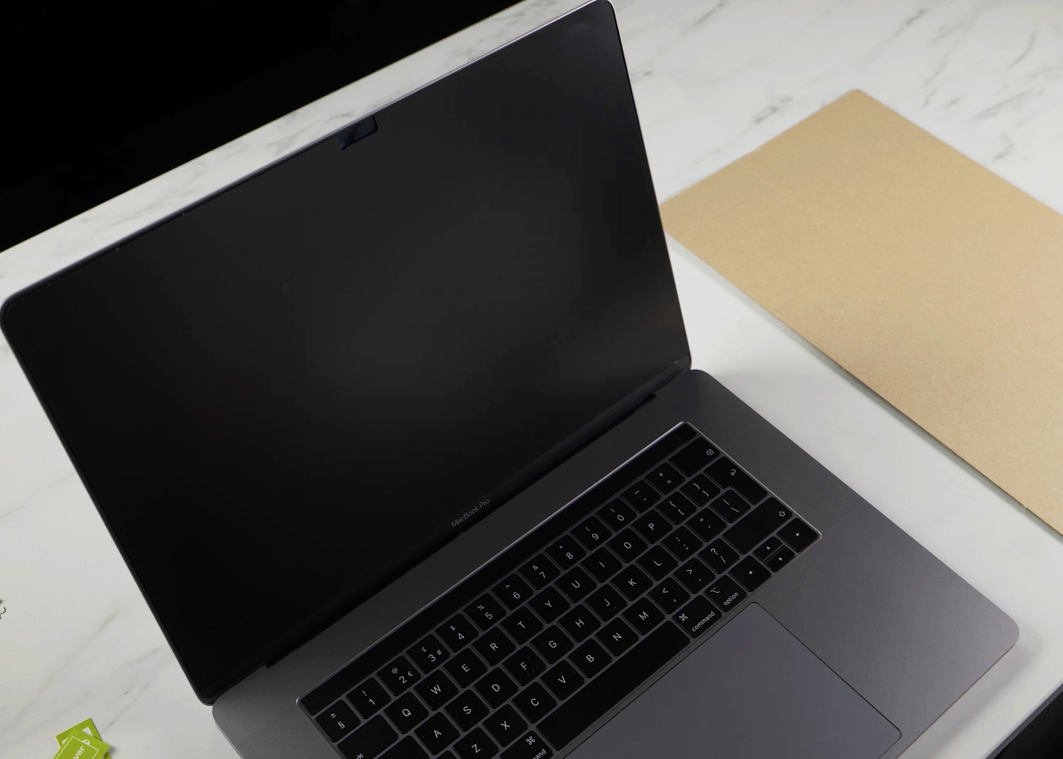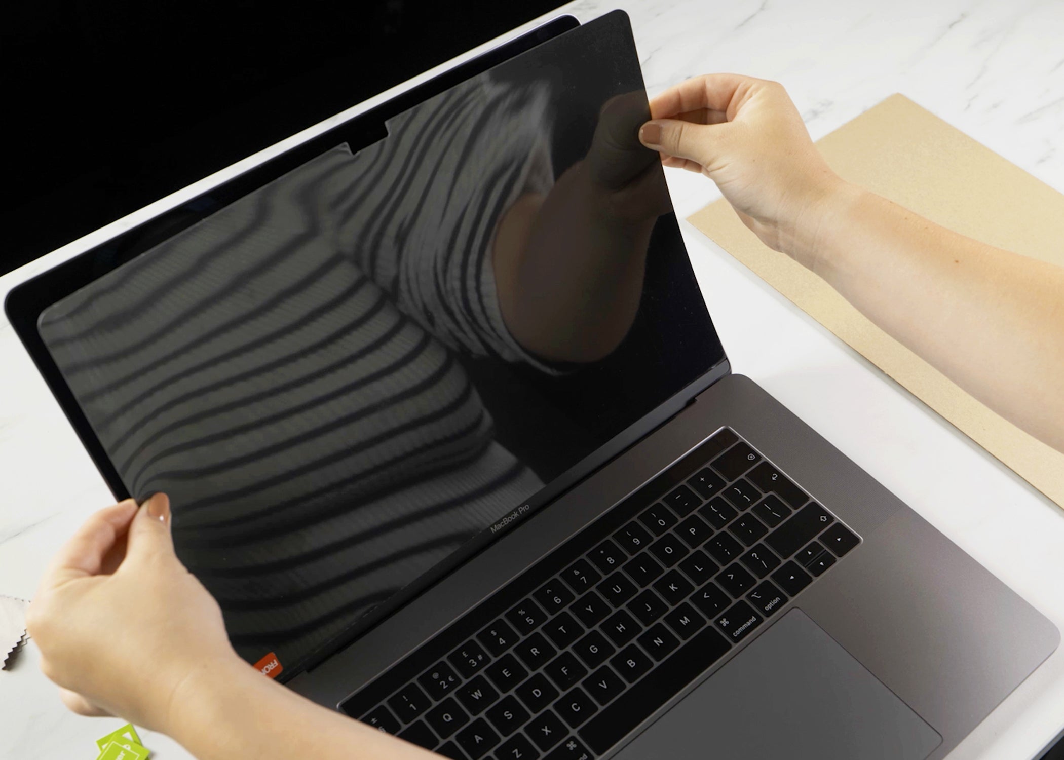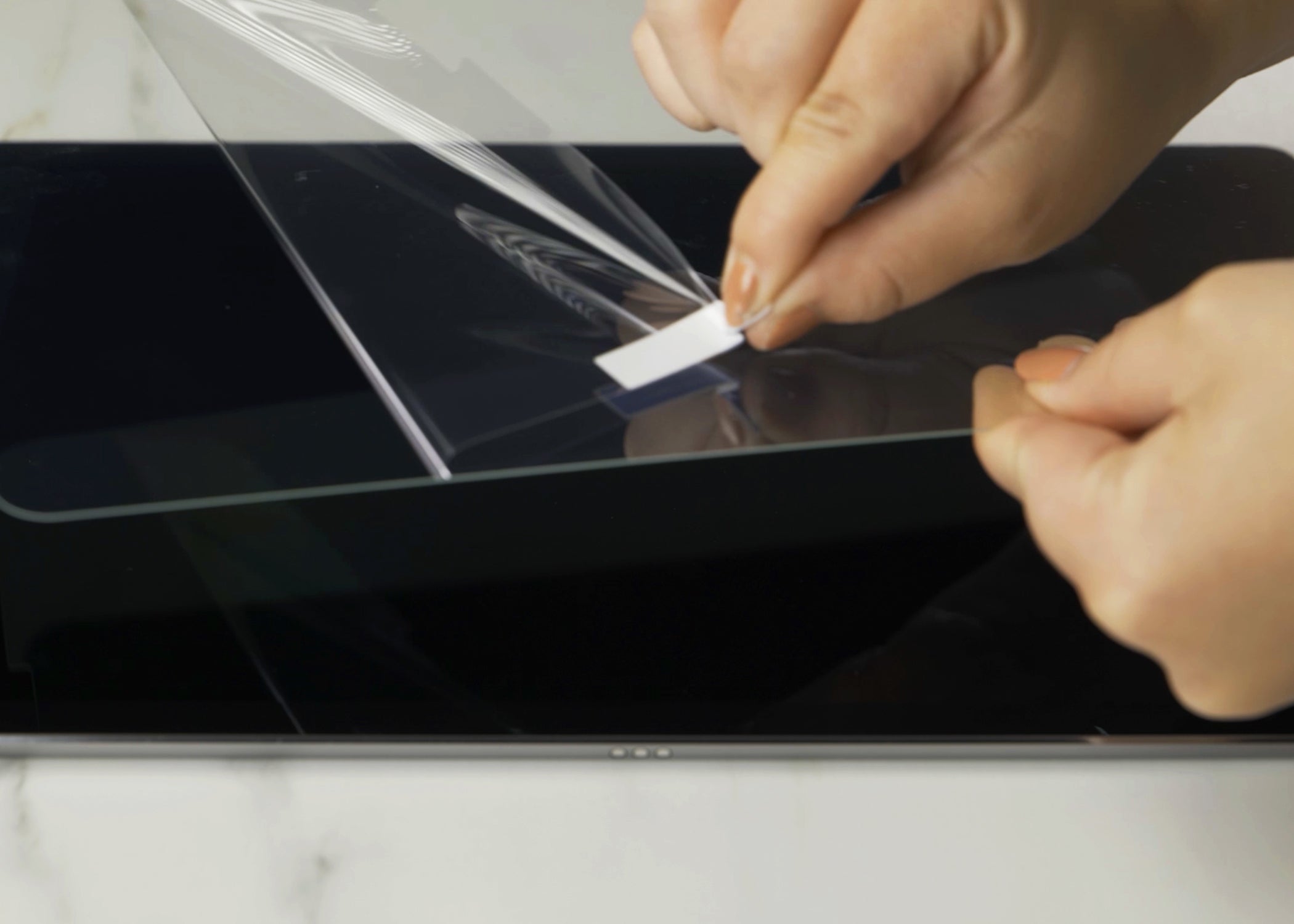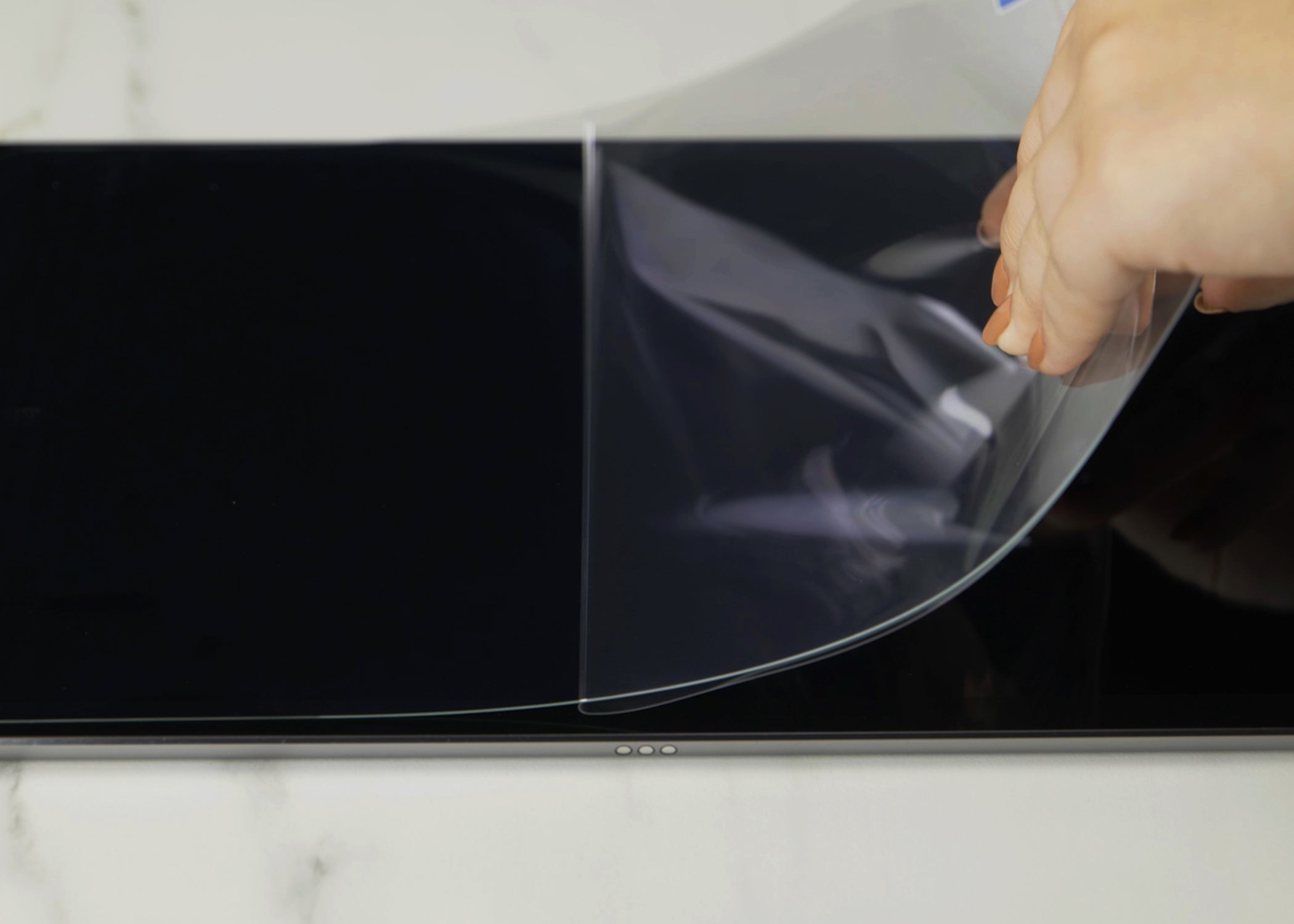 Line the screen protector with your computer device and remove the thin film of plastic labelled "front".
