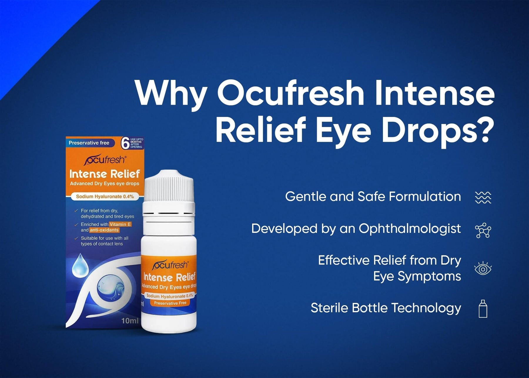 Ocufresh Intensive Eye Drops are expertly formulated to provide long-lasting relief for dry, irritated, and sensitive eyes.